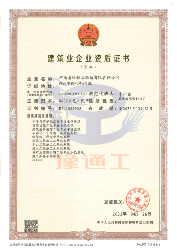 電子與智能化、建筑裝修裝飾、消防設施工程專業(yè)承包壹級;鋼結構工程專業(yè)承包貳級;建筑工程、電力工程、機電工程、城市及道路照明工程專業(yè)施工總承包叁級;施工勞務不分等級。